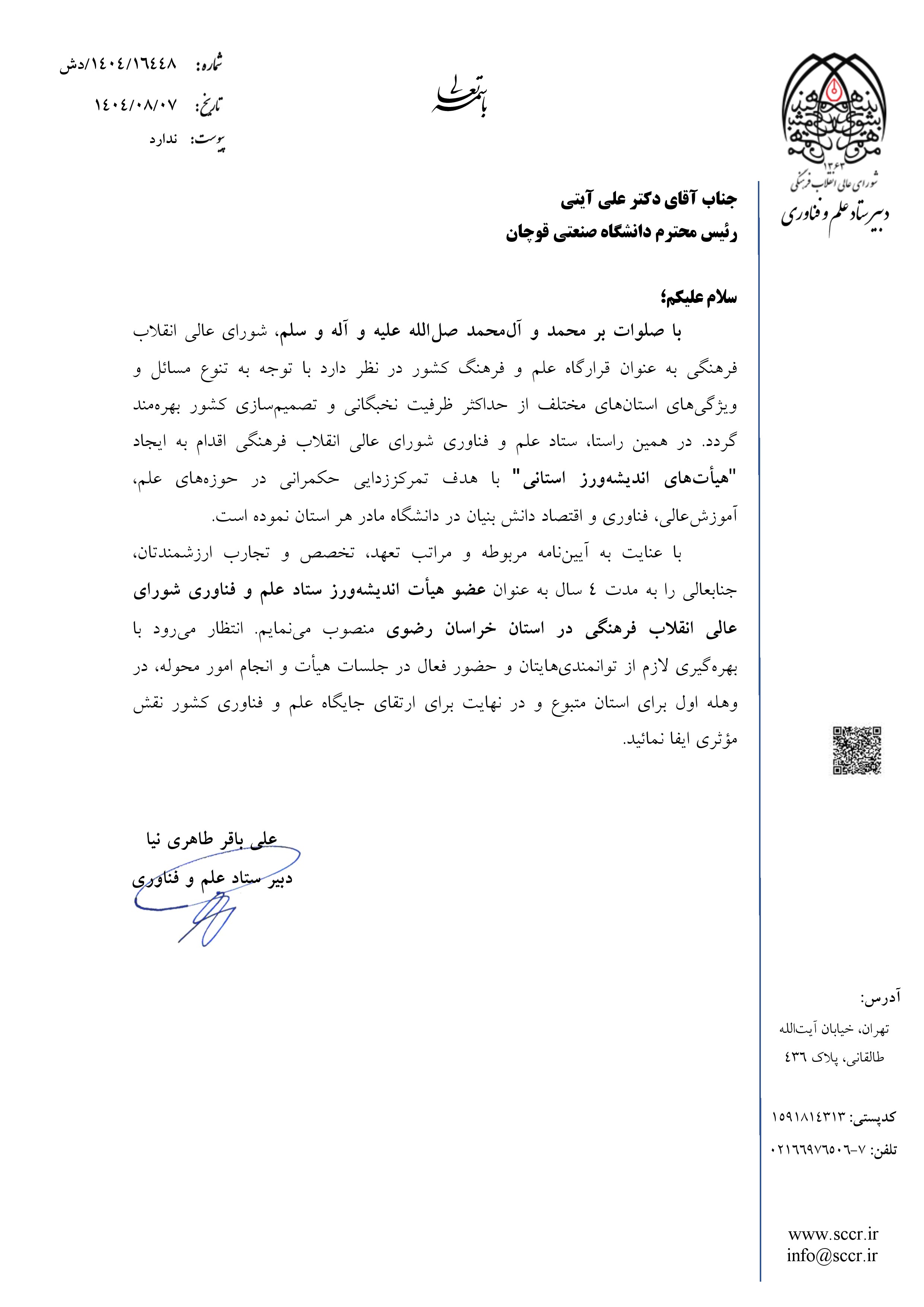 با عنایت به آییننامه مربوطه و مراتب تعهد، تخصص و تجارب ارزشمندتان، جنابعالی به مدت ۴ سال به عنوان عضو هیئت اندیشهورز ستاد علم و فناوری شورای عالی انقلاب فرهنگی در استان خراسان رضوی منصوب میگردید. انتظار میرود با بهرهگیری لازم از توانمندیهایتان و حضور فعال در جلسات هیئت و انجام امور محوله، در وهله اول برای استان مطبوع و در نهایت برای ارتقای جایگاه علم و فناوری کشور نقش مؤثری ایفا نمایید.