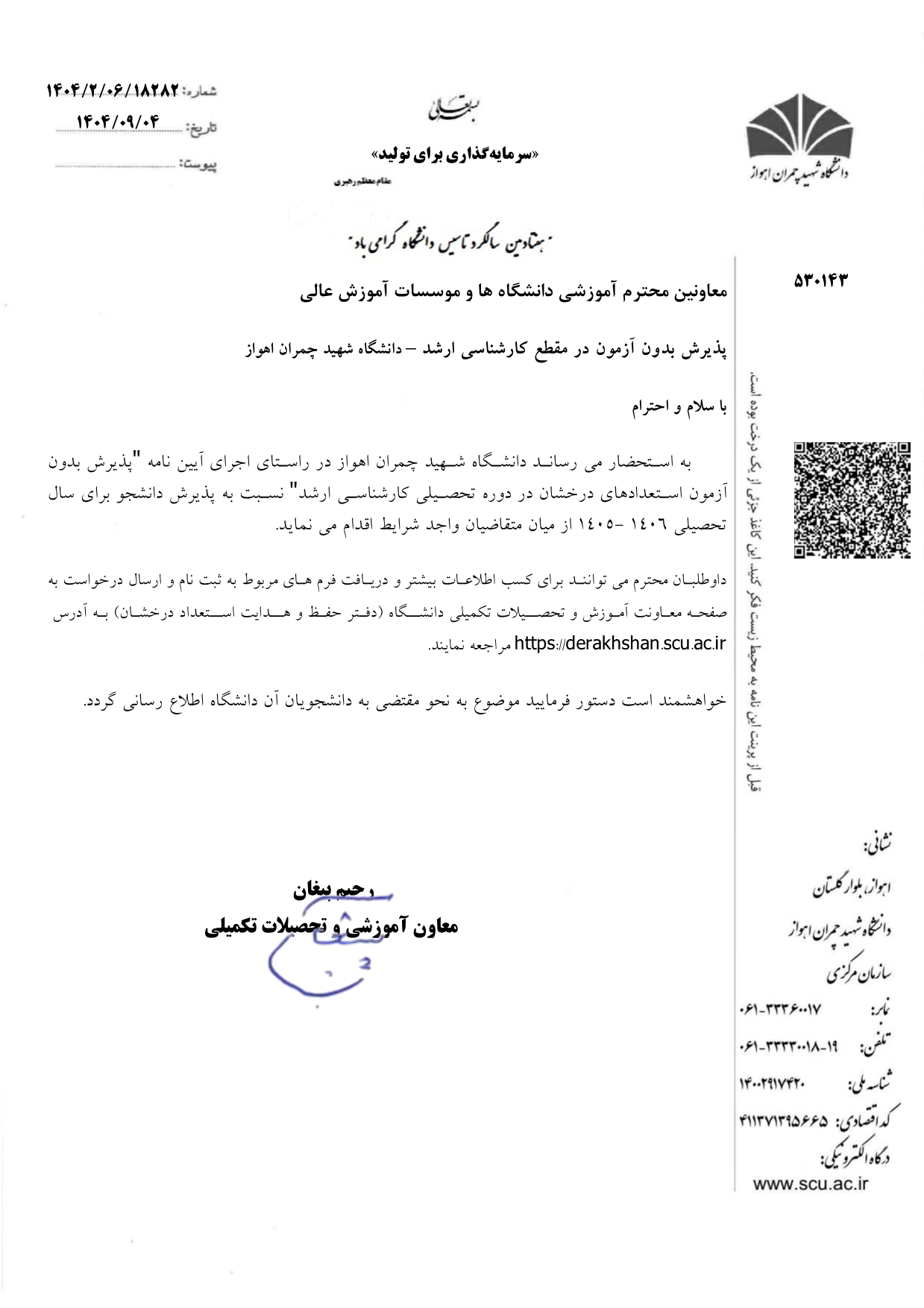 اطلاعیه پذیرش بدون آزمون استعدادهای درخشان در مقطع کارشناسی ارشد - دانشگاه شهید چمران اهواز ۰۸ آذر ۱۴۰۴ | ۱۲:۵۳ کد : ۲۹۴۹ اطلاعیه ها اخبار آموزشی تعداد بازدید:۳۹